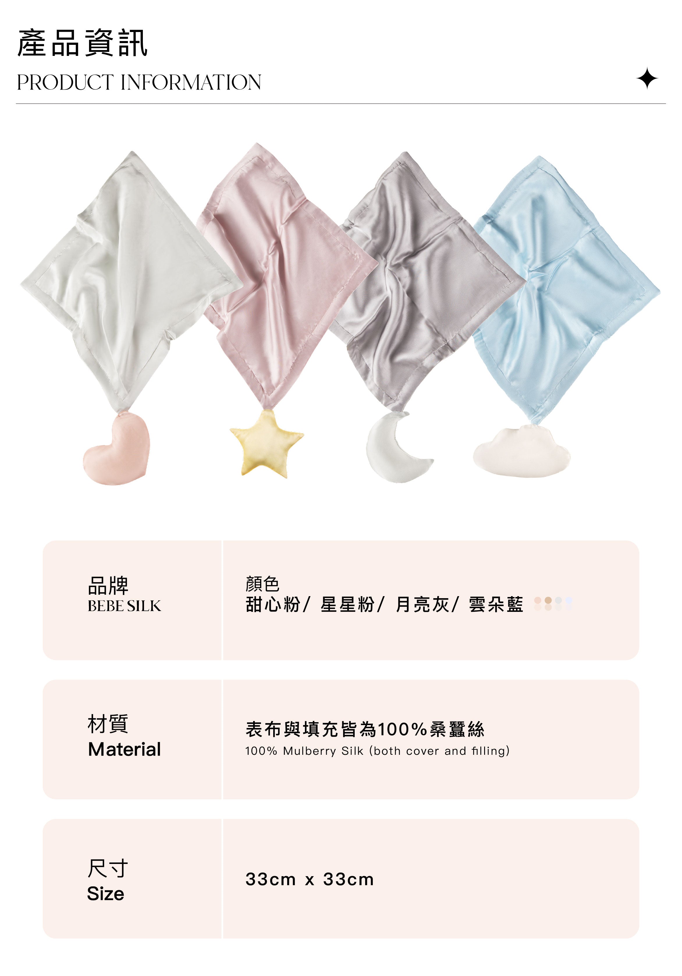 真絲安撫巾是睡眠儀式的情緒錨點,幫助寶寶安定入睡,也讓爸媽安心休息。